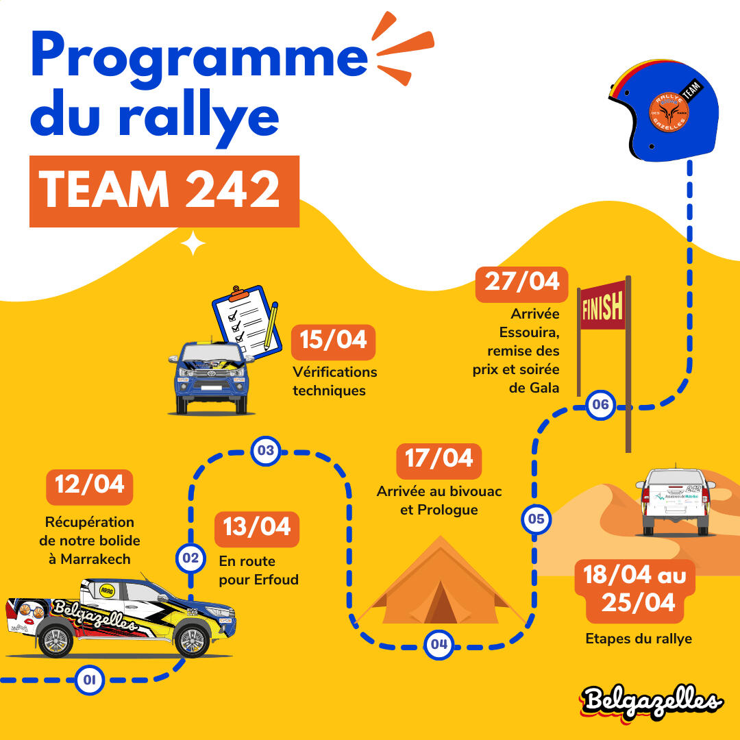 Ne rien lâcher, se dépasser, relever des défis, partager, découvrir, aider, ...Belgazelles c’est tout simplement deux belges qui forment une équipe tenace, avec une camaraderie et une solidarité inébranlables. Prêtes à œuvrer ensemble, à surmonter tous les obstacles et à se pousser mutuellement vers le succès.Le Rallye Aïcha des Gazelles est le défi qu'on s'est lancé pour vivre des moments uniques, découvrir des paysages incroyables et nous dépasser.Les Belgazelles sont en marche, prêtes à conquérir le désert en représentant fièrement la Belgique.Rejoignez-nous dans cette aventure palpitante. Ensemble, nous irons plus loin et nous laisserons notre empreinte dans le désert marocain.